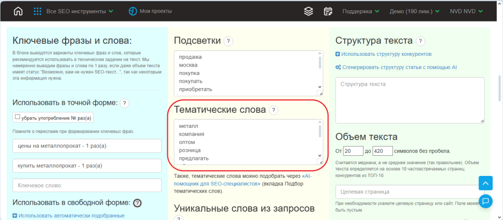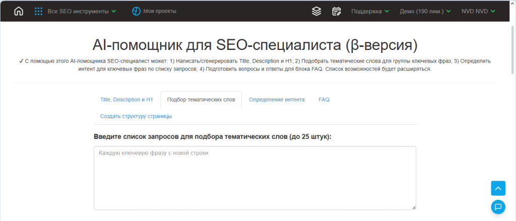 - Зайдите в раздел AI и выберите вкладку «Подбор тематических слов», затем введите запросы