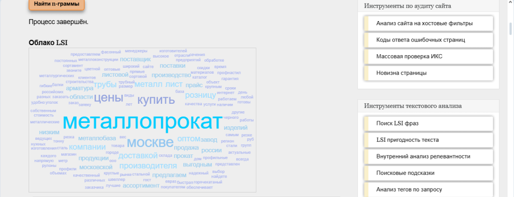 3. По завершении анализа сервис выдаст облако LSI. Чем крупнее шрифт, тем выше частотность в запросах, а значит, тем важнее наличие этого слова в тексте