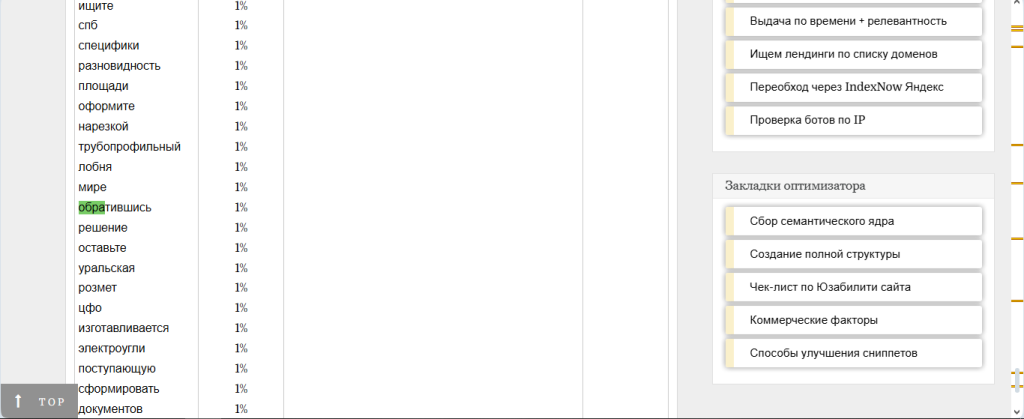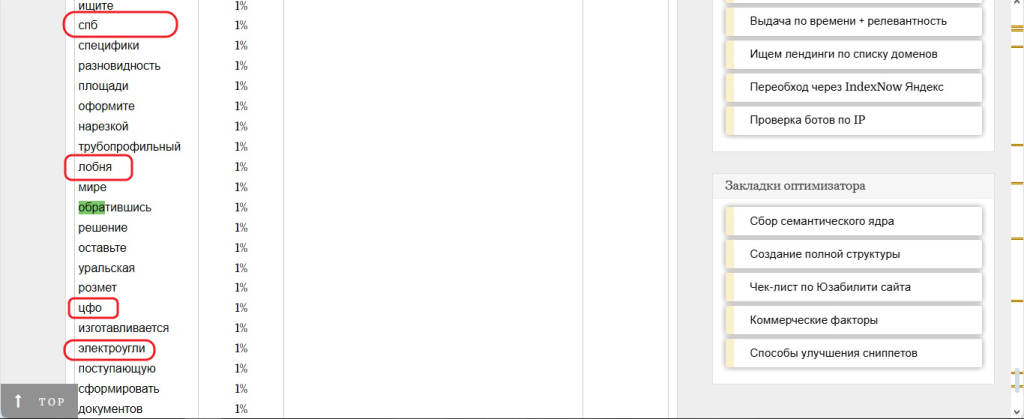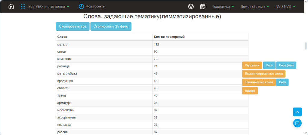 3. После лемм из подсветки и слов из запросов вы увидите список LSI с частотой повторов