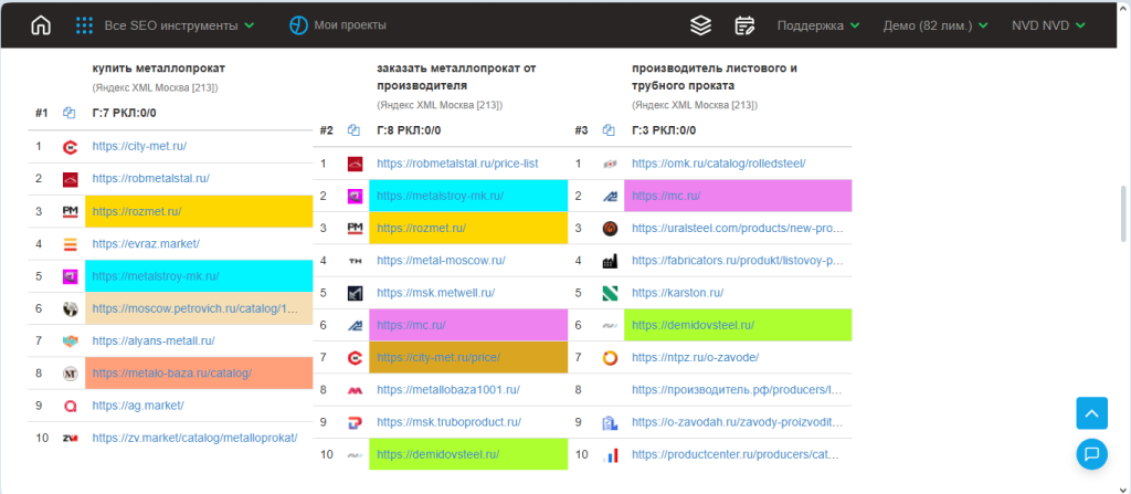 3. Инструмент отобразит 10 сайтов-конкурентов. По каждому запросу будет сформирован свой список, повторяющиеся страницы отмечены маркером для удобства сравнения.