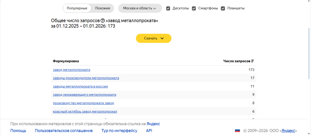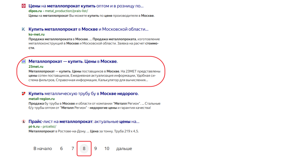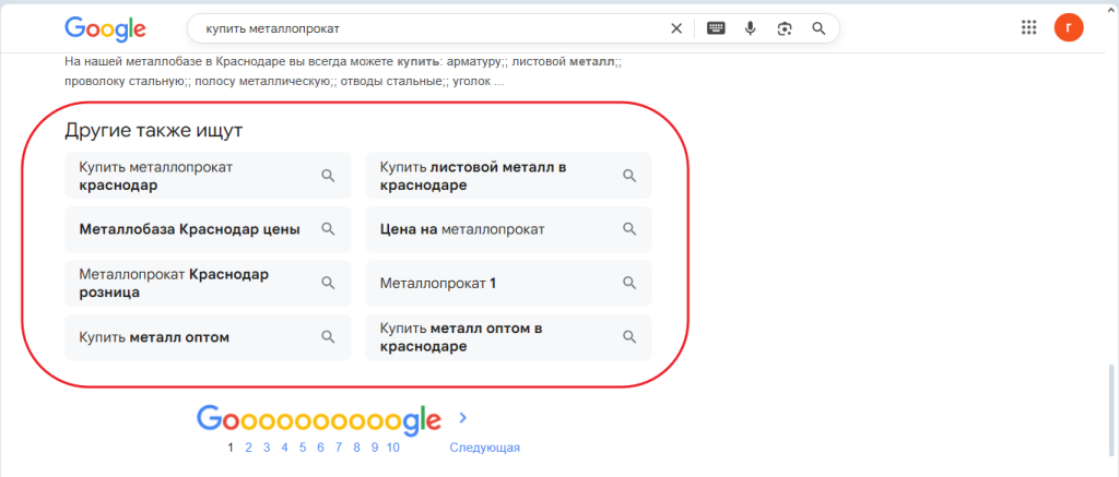 Сначала изучите сайты конкурентов. Чтобы найти их, можно ввести основной запрос (в вашем примере — «купить металлопрокат») в поисковую строку и посмотреть, какие страницы робот выдает в числе первых. Достаточно проанализировать 5-10 конкурентных ресурсов, чтобы увидеть, по каким запросам они продвигаются и какие тематические слова или фразы используют.