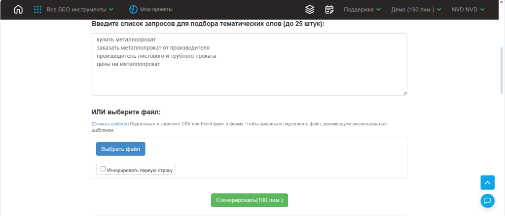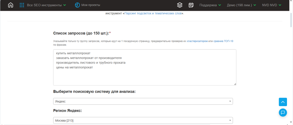 Более быстрый и легкий способ, позволяющий собрать кластер LSI-слов всего за 1-2 минуты. Такие инструменты работают по методу парсинга, они обрабатывают сотни и тысячи строк информации в секунду. Существуют как специализированные, так и универсальные сервисы. Первые используются только для сбора и фильтрации тематических слов, вторые помогают также выгрузить топ-10 конкурентов, собрать СЯ, подобрать фразы из подсветки в сниппетах и даже сформировать ТЗ для копирайтера.