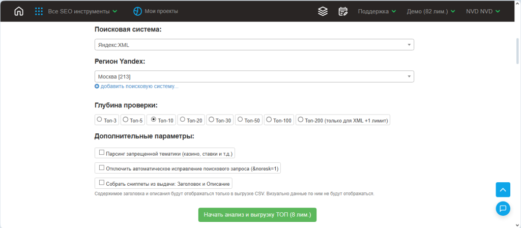 2. Укажите регион, поисковую систему и глубину проработки (в нашем случае — топ-10), нажмите кнопку «Начать анализ и выгрузку»