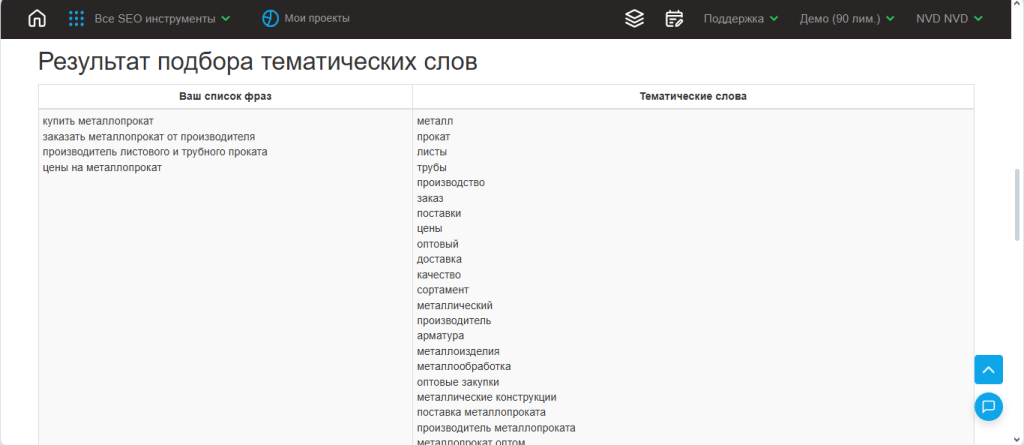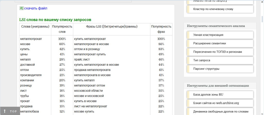 3. Инструмент выдаст таблицу, где слева будут ваши запросы, а справа — LSI