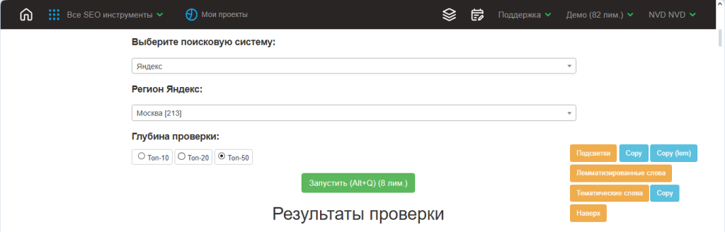 2. Укажите регион, поисковик и глубину проработки, подтвердите командой «Запустить»