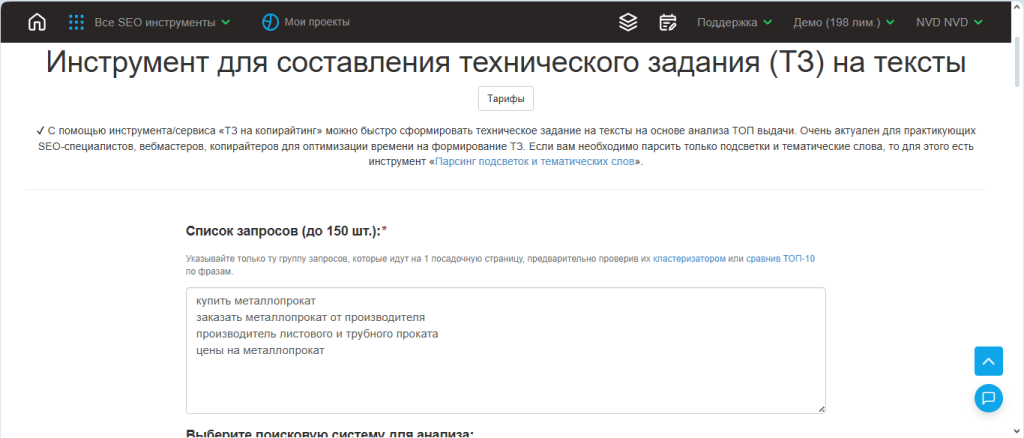 - Откройте вкладку «ТЗ на копирайтинг» и введите список ключевых запросов