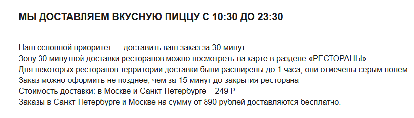 9. Стоимость доставки и ее детализированные правила. Это важно для завершения посетителем пути по воронкам продаж. Неудобства доставочного сервиса, по статистике Яндекс, приводят к отказу от покупки, в среднем, в 36-40% случаев для сегментов: продукты питания, товары для животных, бытовая химия, косметика. Поэтому при оформлении лучше применять калькуляторы, таблицы, схемы. Пример сведений о доставке «Пицца Хат» в Москве.